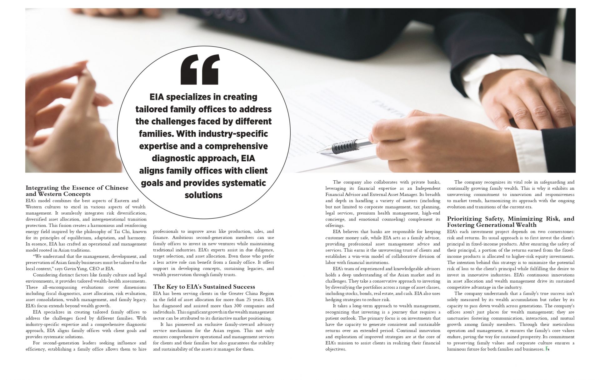 家族辦公室作為管理家族財富的核心工具之一,一直被歐美業界認為是家族企業在不斷變化的經濟大環境中得以穩健穿越經濟週期並能夠實現基業長青、百年傳承的關鍵所在。 而在亞洲地區,尤其是中國大陸,由於文化認知、法律體系等方面的差異,歐美家族辦公室的規劃機制未必能直接適用於亞洲的家族企業。 因此,為了能更好地服務亞洲的家族企業,EIA上浤獨創了秉持尊重家族文化同時遵循國際標準原則的“專屬於亞洲家族的家族辦公室的運營與管理模式”,其發揮的功能和獨具的特色受到美國《金融服務評論》的高度認可。 經多方評定,美國《金融服務評論》最終決定將EIA上浤評為亞太區十大優秀財富管理解決方案提供機構之首;該機構認為EIA上浤能在入選的十大機構中脫穎而出、雄居榜首的原因主要源於以下這些獨特的要素。